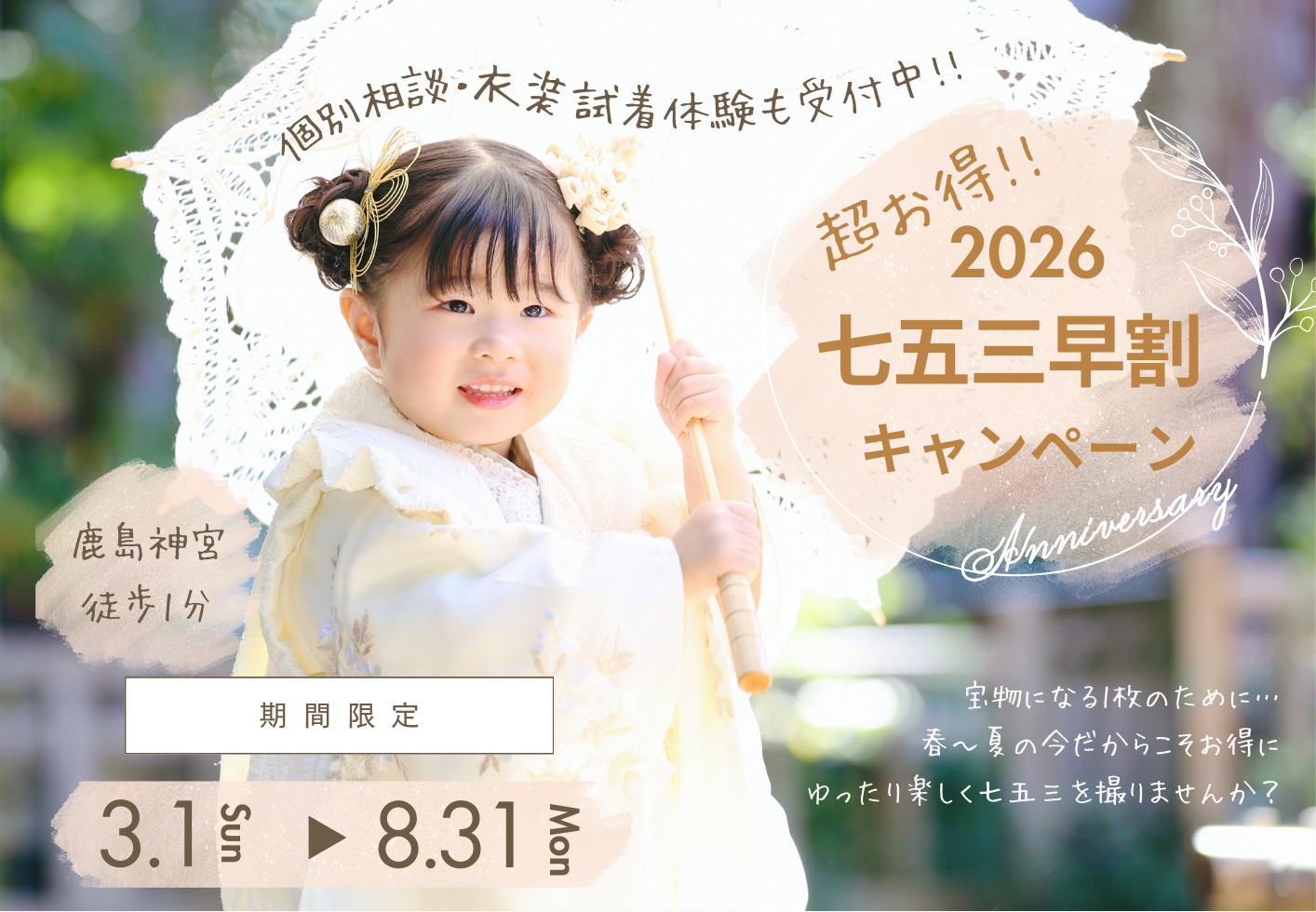 About us 宝物になる一枚のために・・・写したいのは今この瞬間の愛おしさ 日々成長するお子様とご家族のかけがえのない幸せな時を何十年経っても 色あせないふと笑顔になれる・・・想い出としてかたちに残すこと これが私たちの目指す写真スタジオの姿です イシヤについて NEWS&TOPICS新着情報 2026七五三早割キャンペーン 2026年卒入園卒入学キャンペーン NEW七五三プレミアムプラン NEW鹿島神宮ロケーションプラン 2026七五三早割キャンペーン 2026年卒入園卒入学キャンペーン NEW七五三プレミアムプラン NEW鹿島神宮ロケーションプラン Photograph撮影メニュー マタニティ ニューボーン お宮参り・百日祝い バースデーフォト 七五三 卒入園・卒入学 2分1成人十三参り 成人式 ウェディング ファミリーフォト ロケーションフォト シニアフォト 証明写真 PhotoGallery フォトギャラリー フォトギャラリーへ